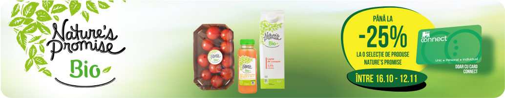 Gama Nature’s Promise BIO îți oferă o varietate de alimente certificate organic, obținute din agricultură ecologică, fără pesticide sau îngrășăminte chimice de sinteză: de la fructe și legume proaspete, crescute în România, la carne și lactate, conserve de tot felul, făinoase, amestecuri